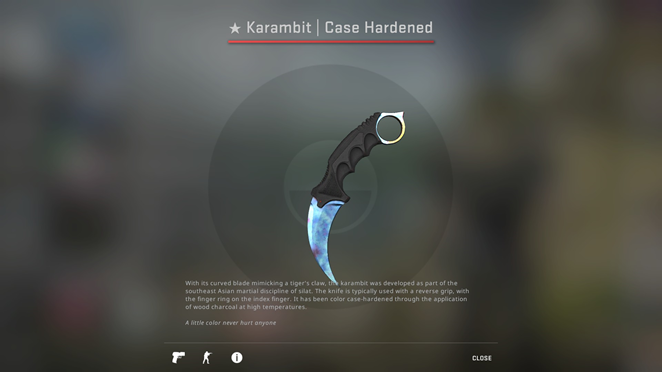 After seeing all of these amazing sticker crafts and their insane prices, you may think that one of these would fetch the highest price in all of CSGO. Unfortunately for you, you’re very wrong. The most expensive item in CSGO is in fact a knife, a Karambit Case Hardened Blue Gem in Factory New condition. This specific knife has a current estimated price of around $750,000 and may just be the most iconic item in CSGO with the probability of unboxing this exact knife being 1 in 804 million.