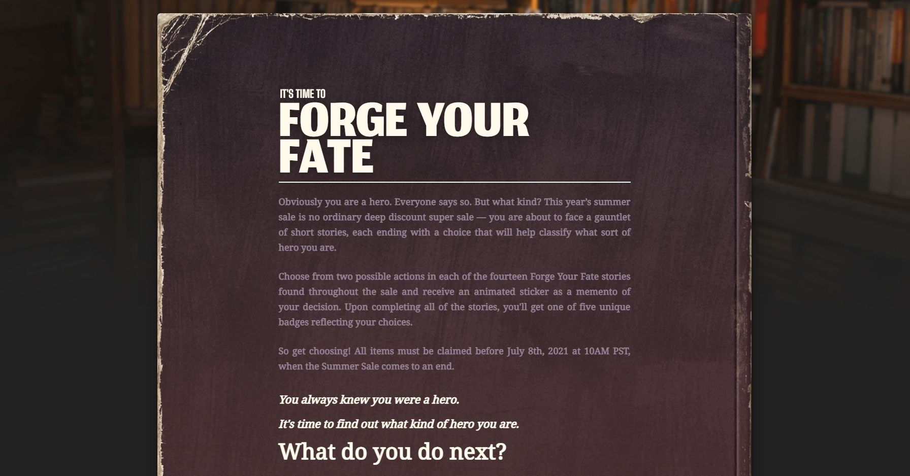 On this year's Steam Summer sale event, you are given various little stories where you have to make choices to earn according Steam badges and summer sale cards which is not too exciting admittedly but still a fun addition to this yearly event!