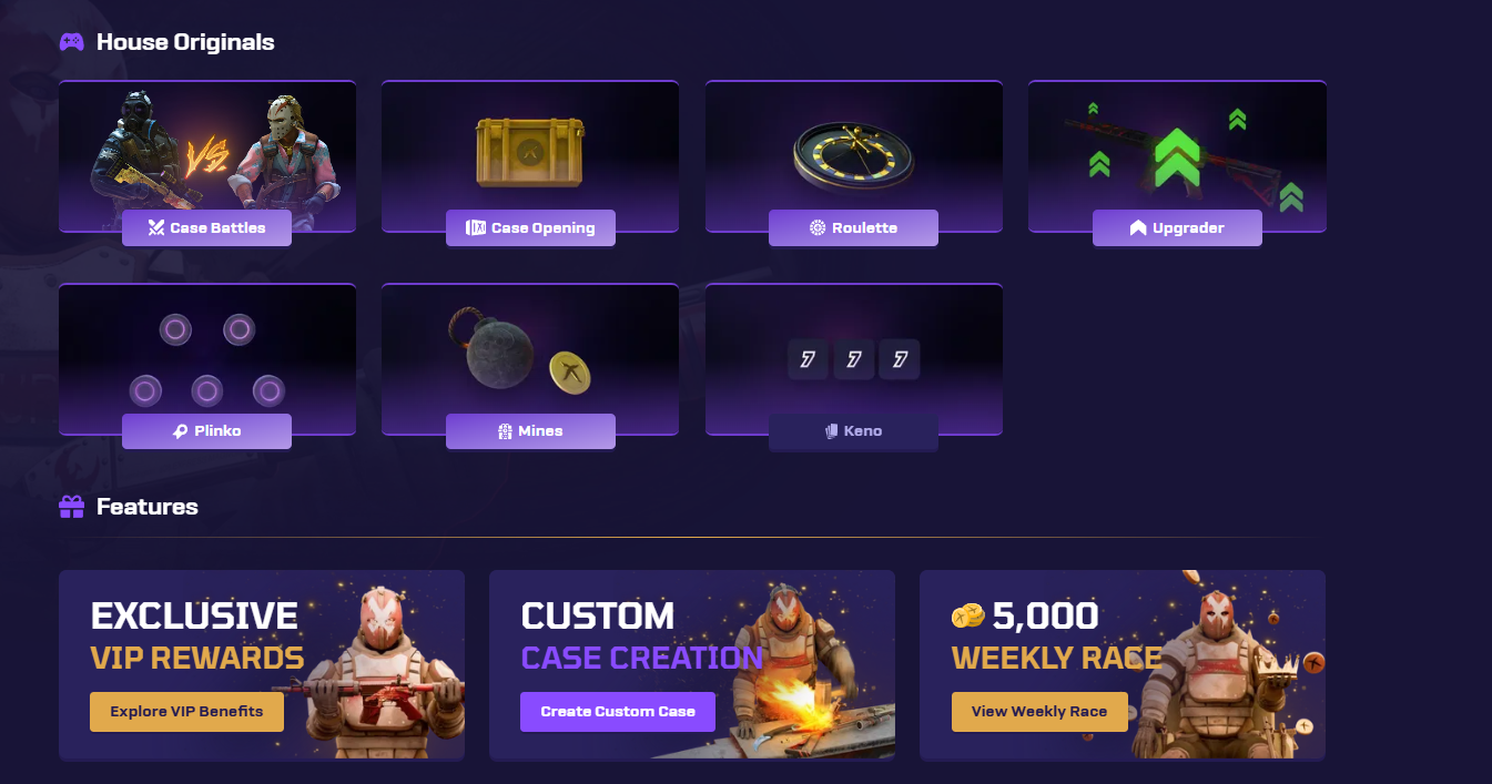This coverage of in-house games already features a lot of the community favorites such as case battles, roulette and mines.