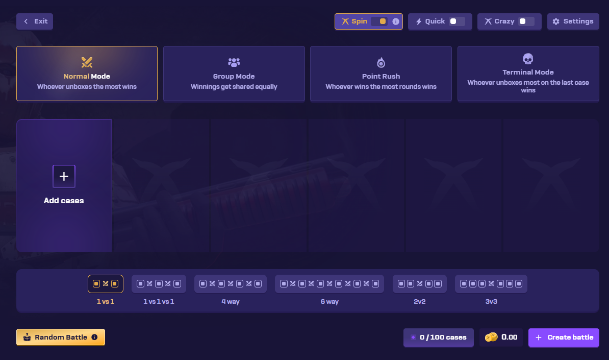 Especially their case battles never become boring due to having 166 official cases to choose from and being able to spice things up with all sorts of customisation when it comes to choosing different team sizes or game modes within the case battle creation itself: