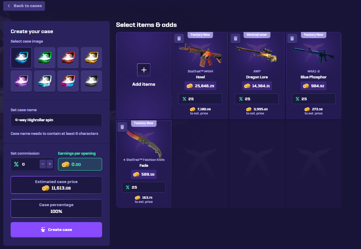 If 166 different cases aren't enough for you yet, you can also spend ages to create your own custom cases where you get to choose the exact items and odds in order to craft exactly what you are looking for: