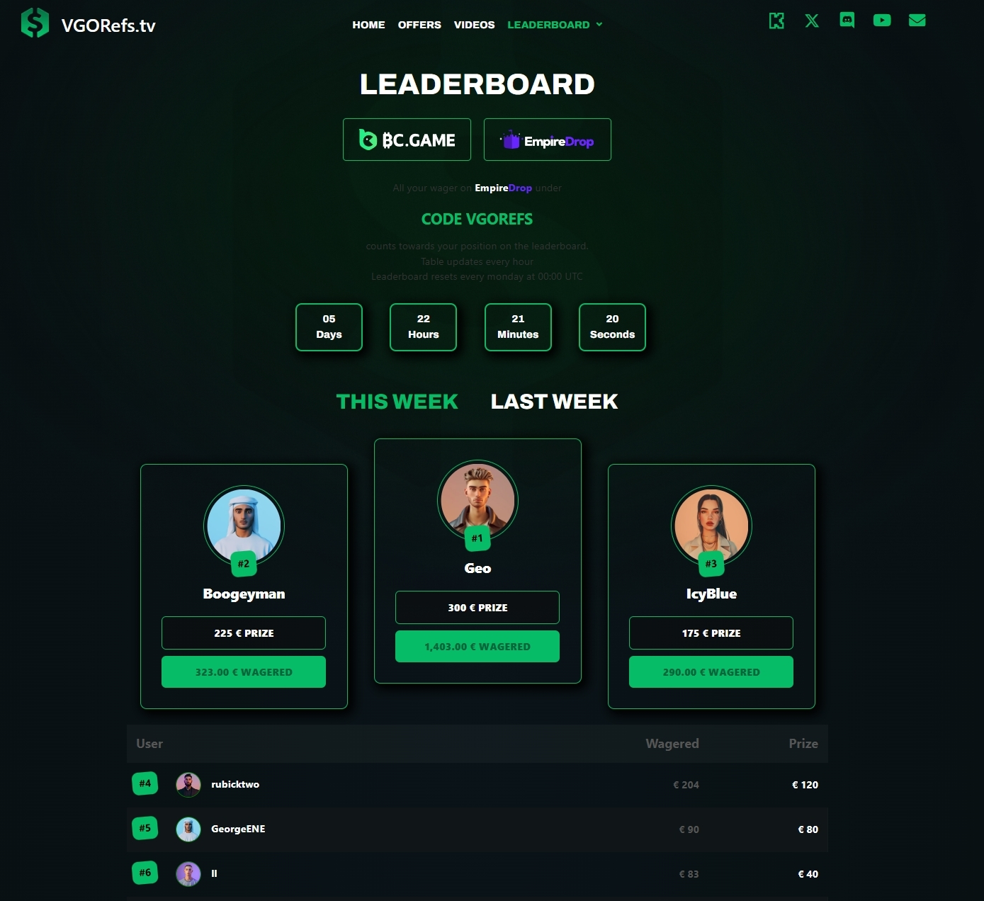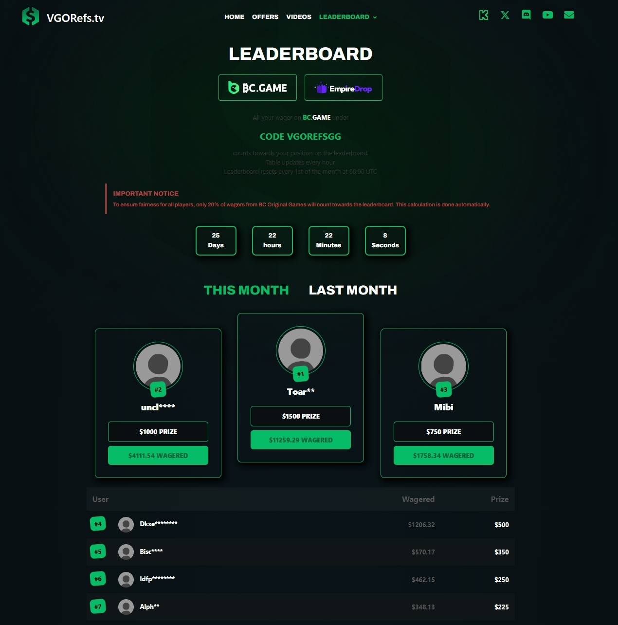 Next to their brief overview of websites and their welcome bonuses, they also operate VGORefs.tv which is a website that rewards active players with massive leaderboard prizes if they use their referral code on the partnered websites: